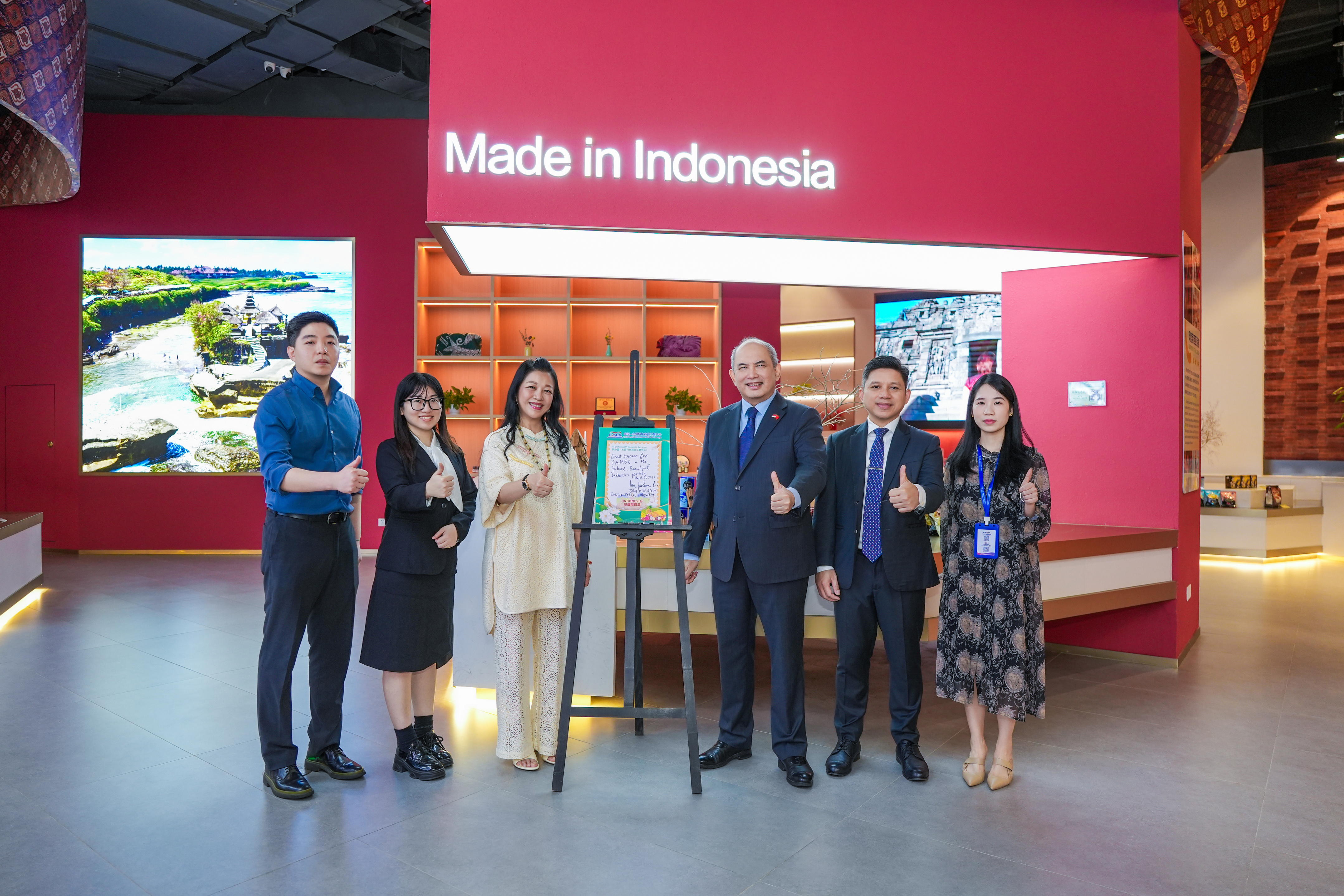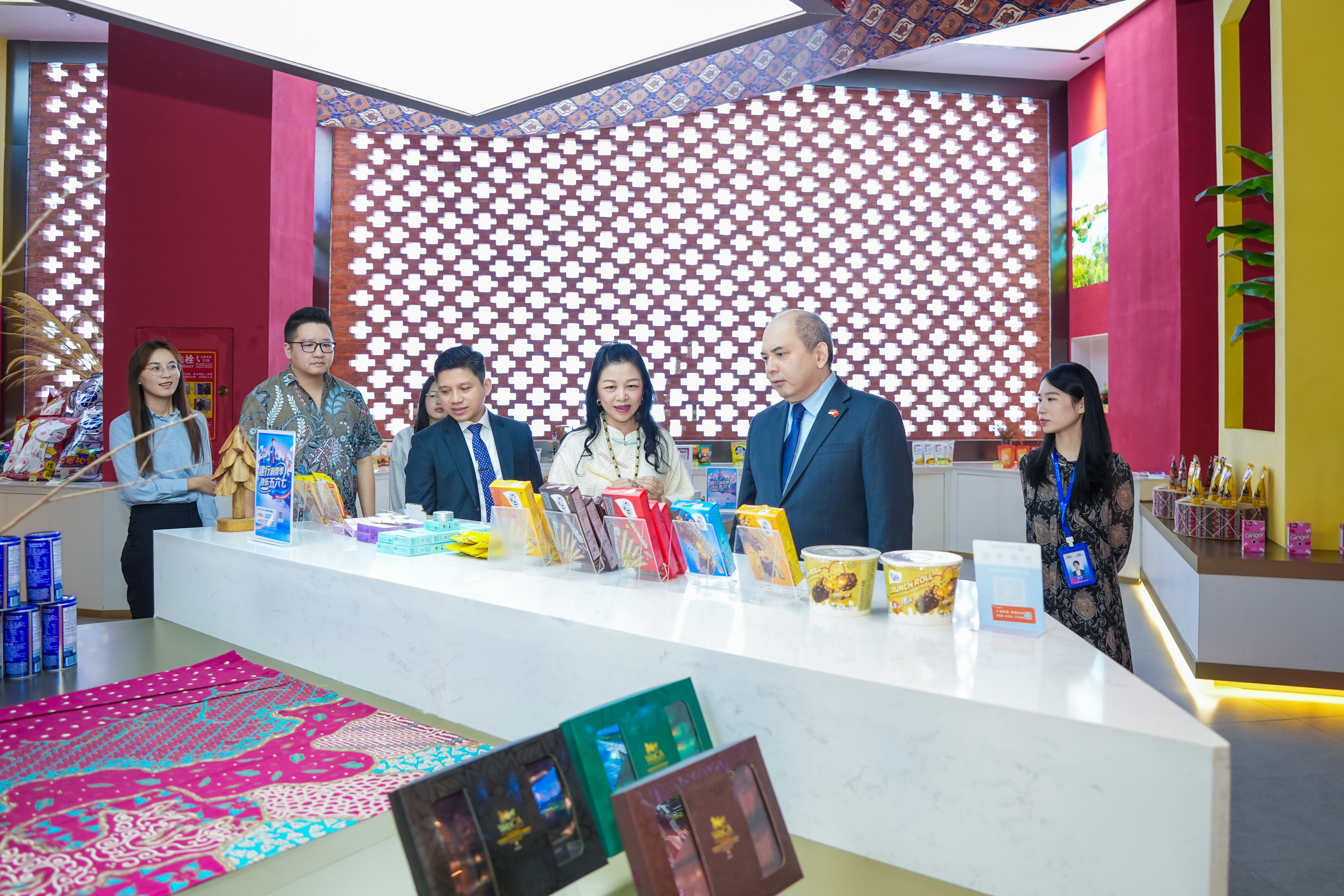 在愉悅的氛圍中,大家步入印尼館??傤I(lǐng)事幽默說道:“歡迎來到擁有1.7萬座島嶼的‘千島之國’——印尼!”。他欣喜表示,與上次到訪相比,館內(nèi)的商品種類不僅豐富了,而且展陳更具印尼當(dāng)?shù)靥厣屓搜矍耙涣?。?dāng)?shù)弥?jīng)由領(lǐng)事館引薦入駐的多款印尼特色商品比如貓屎咖啡、蝦片、巴迪布等深受消費者青睞時,他深表感謝,也十分感動。他介紹,印尼資源豐富,特色商品多元,許多產(chǎn)品都希望開拓中國市場。他認(rèn)為,匯聚中心為印尼商家進(jìn)入中國搭建了重要的橋梁——不僅將印尼文化精髓完美呈現(xiàn),更專門打造了面向印尼商家的主題展館,為印尼產(chǎn)品開拓中國市場提供了有力支撐。