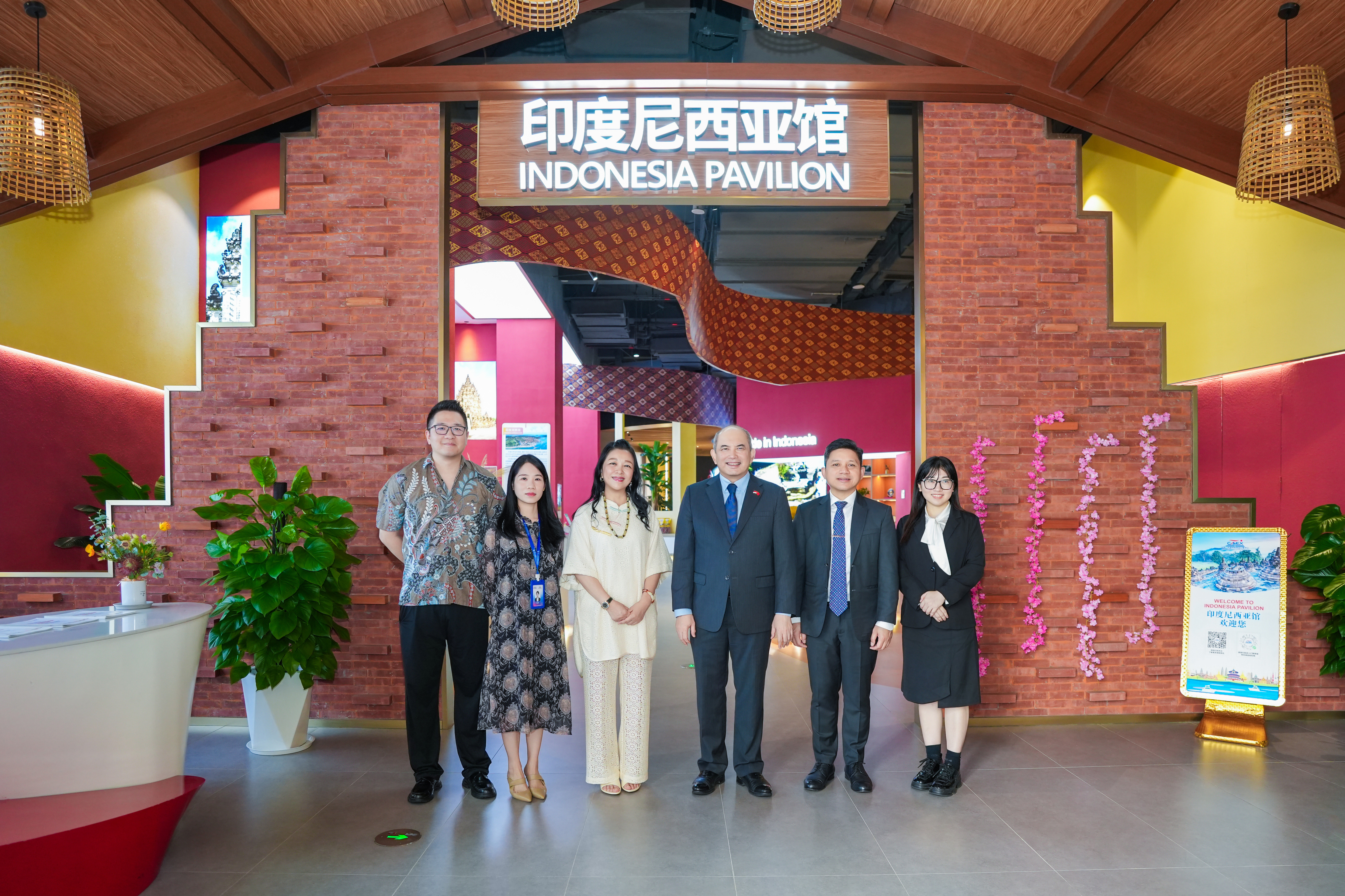 總領(lǐng)事一行在匯聚中心印尼館合影留念